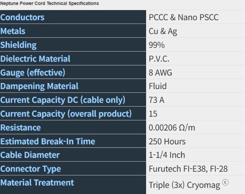 The Diamond Revision Neptune AC Power cable possesses a lucullan midrange that seduces you with its rich, three dimensional presentation of vocalists; a deep, wide soundstage with velvety, rich, silent dark space between instruments that present themselves with golden tonality.